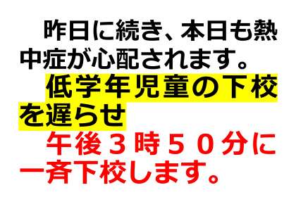 7月11日 低学年の下校を遅らせます 公開日 2023/07/11 更新日 2023/07/11 お知らせ 本日も昨日と同様、猛烈な暑さとなっています。低学年の下校を遅らせ、15時50分に一斉下校とします。急な対応が続きますが、ご協力よろしくお願いします。