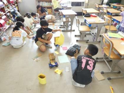 風を受けて進む車の推進力アップを目指して、帆の形を工夫しています。試行錯誤を繰り返しています。