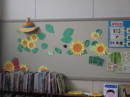 図書館の掲示が夏バージョンに 公開日 2023/07/18 更新日 2023/07/18 お知らせ 図書館ボランティアの方たちが、図書館の掲示を夏バージョンに変えていただきました。夏らしいひまわりやきんぎょなど、たくさん飾られて、とても華やかになりました。