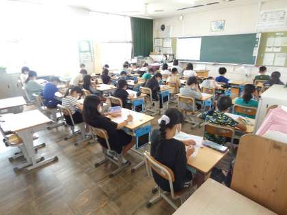 夏休み前にこれまで学習したことをテスト形式で復習していました。みんな集中していました。