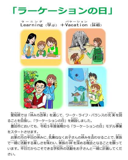 本日、ラーケーションの日の保護者用リーフレットとラーケーションカード(申請用)を子どもたちに紙に印刷したものを配付しました。ご活用ください。
