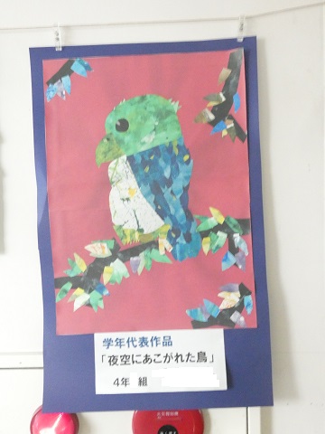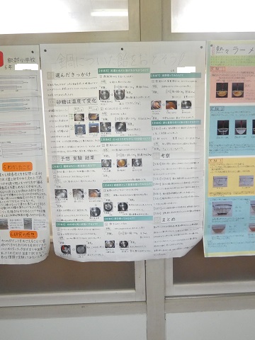 理科室の前には、自由研究の作品がかざられていました。廊下には、子どもたちの創造的な作品がかざられています。
