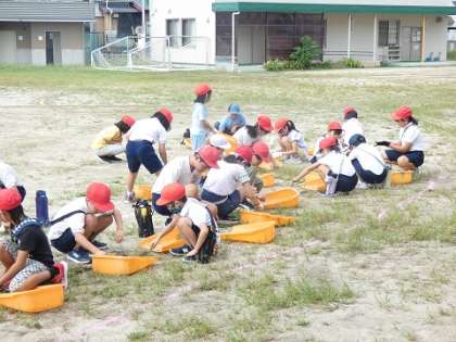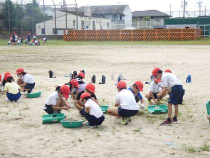 今日のファミリー活動は、運動場の草取りをしてくれました。運動会で走るトラックの草を一生懸命に取りました。6年生の子たちが、率先して草取りをして、お手本を見せてくれました。