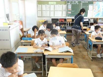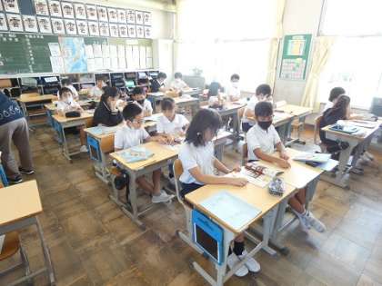 4年生 外国語の授業 公開日 2023/09/13 更新日 2023/09/13 お知らせ 室内のいろいろなものを英語で質問されて、ペアで競争で答えていました。外国語の学習では、楽しく学習するためにいろいろな学習方法が、工夫されています。