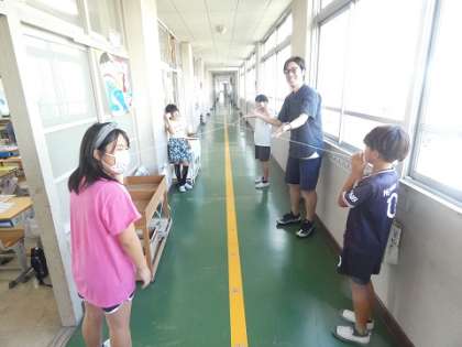 音の伝わる仕組みについて、糸電話を使って実験しました。