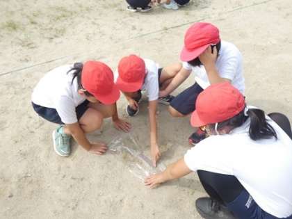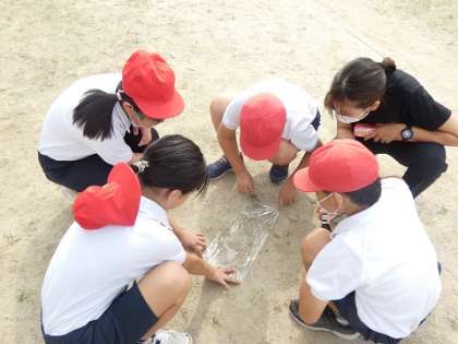 サランラップとペットボトルの水を使って、水が高いところから低いところに流れていくことを確認しました。