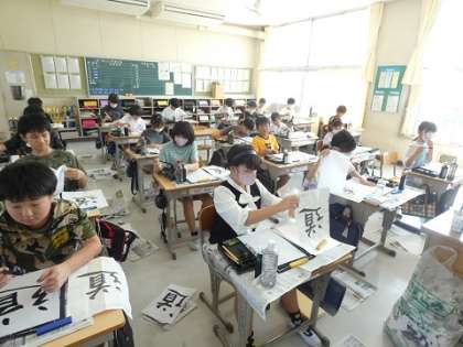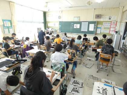 冷房の効いた教室で落ち着いた雰囲気で習字をしています。
