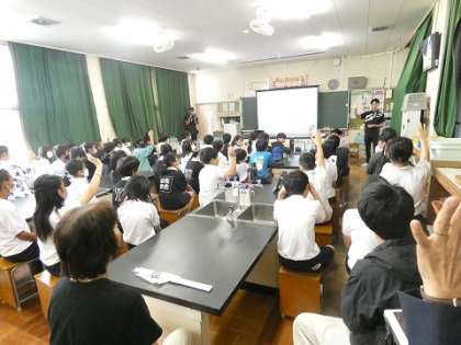 水素エンジンGRヤリスのデモ走行の前に、6年生は「カーボンニュートラル」を目指した取組についての座学がありました。