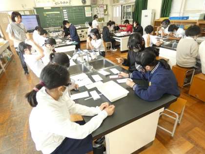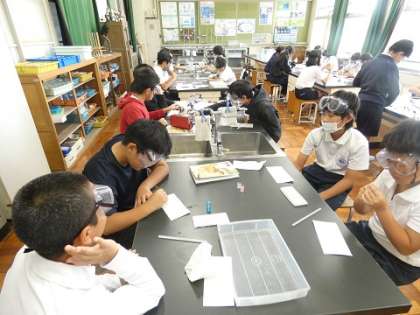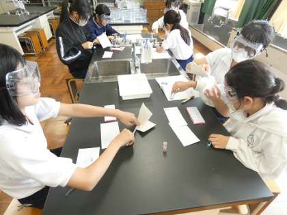 水溶液の性質の学習でリトマス紙を使って、酸性、中性、アルカリ性を調べていました。安全対策でゴーグルをつけています。