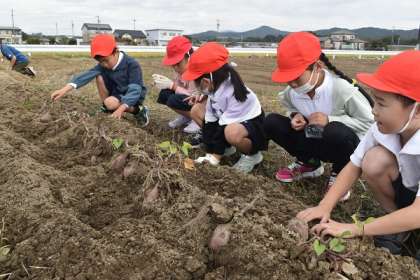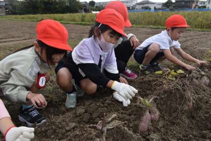 畑を掘りおこしてサツマイモを収穫しました。子どもたちはニコニコです。