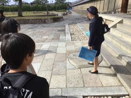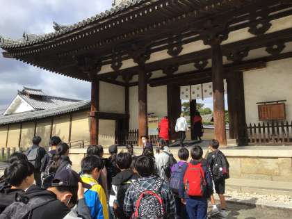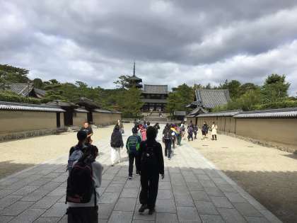 法隆寺に到着しました。みんな、水難を防ぎ幸せになれるという「たいいし」を踏んで法隆寺に入りました。