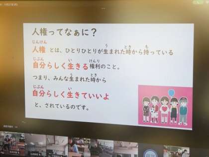 11月27日 児童集会 公開日 2023/11/27 更新日 2023/11/27 お知らせ 4連休明け、元気に登校した子どもたちは、オンラインで児童集会を行いました。福祉JRC委員会から、人権週間について呼び掛けが行われました。図書委員会ら図書館祭りの説明と呼び掛けが行われました。