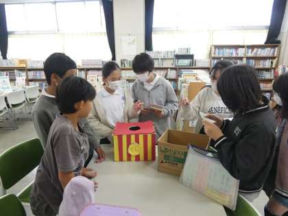 図書館祭り 公開日 2023/11/28 更新日 2023/11/28 お知らせ 図書館祭りが、始まりました。早速、図書室で本を借りに来ていました。図書委員さんたちが、本を借りた子にくじをひいてもらっていました。この冬は、たくさん本を借りて、たくさん本を読みましょう。