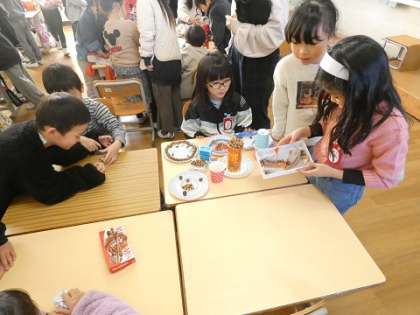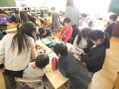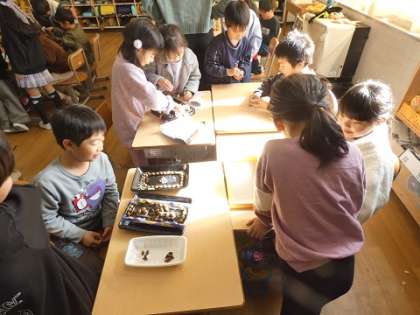 作った作品を1組と2組のみんなで見合って、作品のいいところをたくさん探しました。
