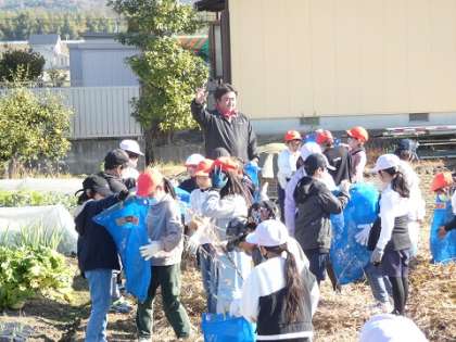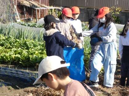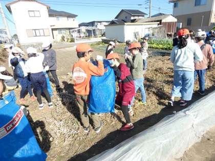 JA上郷営農センターの方に大豆の収穫の仕方を教えていただきました。網の袋に大豆を枝ごと入れて叩いています。