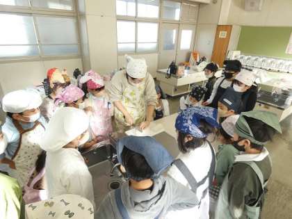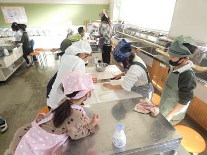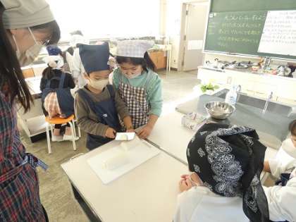 今日は、2年1組が大根パーティーをしました。先生に安全に大根を切る方法をしっかりと教えてもらってから、いちょう切りで大根を切りました。けがをしては、いけないのでみんな真剣に聞いています。切った大根でおでんを作りました。