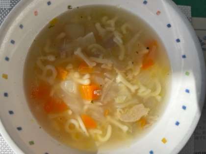 今日の給食は、クリスマスメニュー。ガトウショコラのケーキにチキンライス、オムレツ、アルファベットの麺の入ったパスタスープでした。