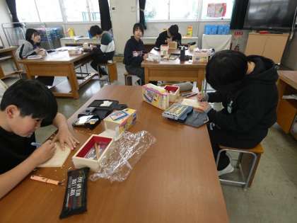 6年生 図工の授業 公開日 2024/01/24 更新日 2024/01/24 お知らせ 卒業制作のオルゴール箱の制作をしています。自分の名前をデザインして扉の材料を削ります。オルゴールの曲は、校歌や好きな歌を選びます。いつまでも大切なものを入れておけるような素敵な作品になるとよいですね。
