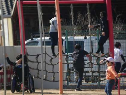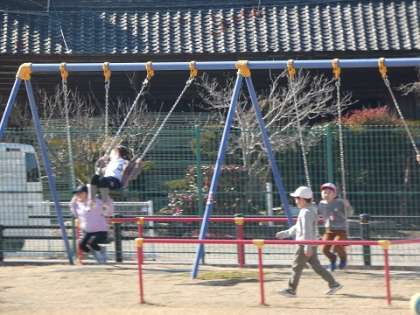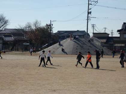 晴天で気持ちの良い天気なので、たくさんの子どもたちが運動場で遊んでいました。小学校では、遊具が人気です。