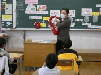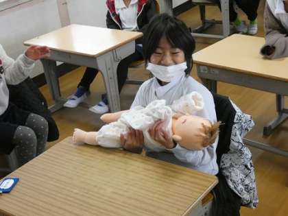 おなかの中で赤ちゃんがどんなふうに大きくなるのかを勉強しました。授業の最後に赤ちゃんの人形を優しく抱いた時の何とも言えない表情が印象的でした。