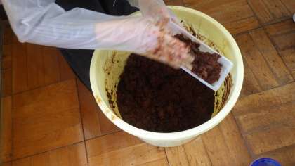 昨年の4月末に桝塚味噌さんに教えていただきながら、味噌つくりをはじめた味噌がおいしく育ちました。今日、家に持ち帰るのでおいしく召し上がってください。