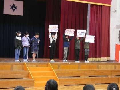 5年生 ありがとう集会の出し物 2 公開日 2024/03/14 更新日 2024/03/14 お知らせ コントをしたり、6年生の思い出クイズの中に「2年生の時の運動会のダンス」を一緒に踊ったり、6年生に教えてもらった山の学習のホイボールを披露したりしました。