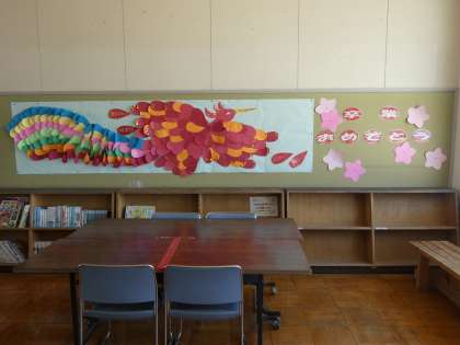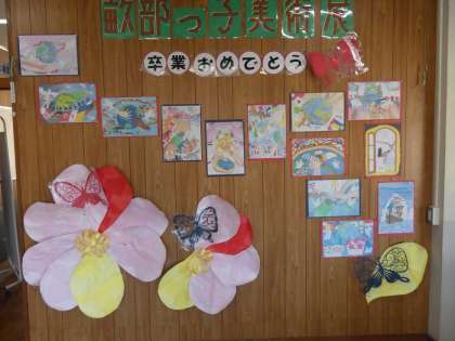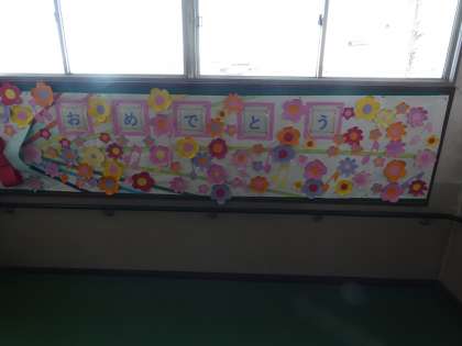 6年生の卒業を祝うために校内の掲示板が卒業モードになっています。