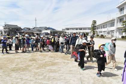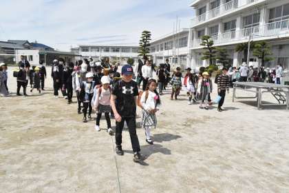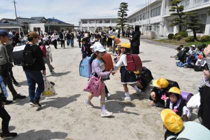 朝お迎えに行くお兄さん、お姉さんが新入生を通学班の並ぶ場所にに連れてきて、1年生の保護者と一緒に下校しました。