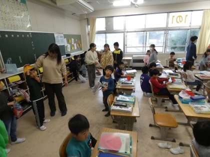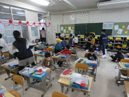 春の嵐のような激しい雨が降る中、傘をさして登校してきた1年生たちを6年生が教室で優しく準備や着替えの手伝いをしていました。