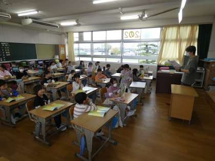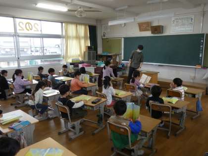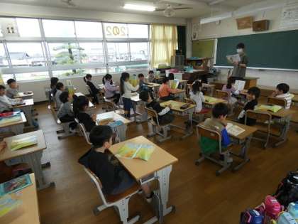 元気の国語の教科書の朗読をする声が聞こえます。楽しそうな雰囲気で授業が進んでいます。