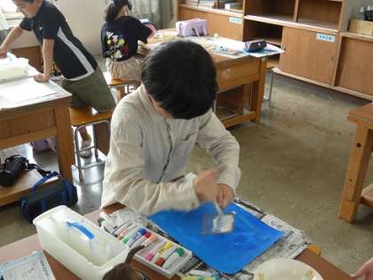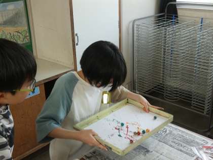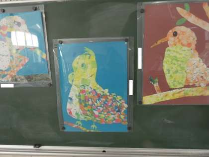 4年生 図工の授業 公開日 2024/04/17 更新日 2024/04/17 お知らせ ビー玉に絵の具を付けて転がしたり、ブラシで吹き付けたりして遊びのように楽しく模様を作った後で、その紙を切り抜いて、コラージュの技法で鳥の羽根として貼り付けて、きれいな鳥を描きます。子どもたちは、夢中で作品作りをしていました。