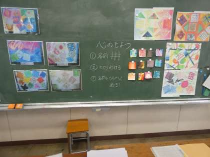5年生 図工の授業 1 公開日 2024/04/23 更新日 2024/04/23 お知らせ 5年生の授業では、少し抽象的で難しいことに挑戦しています。画用紙を正方形に切って、その紙に自分の心の中を表現して描きます。友だちの心を描いた紙を交換して集めたら、それを繋げて物語を作ります。
