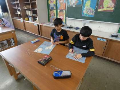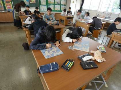 6年生の図工では、自分と友達が一緒にリコーダーやピアニカを演奏している姿を版画で描いています。