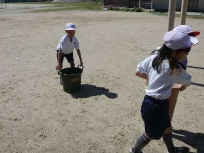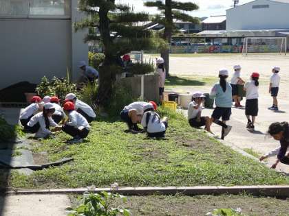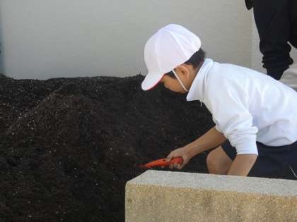 夏野菜を育てるためにプランターに土を入れたり、畑の草取りをしました。