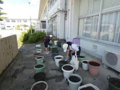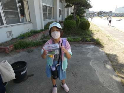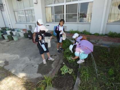 朝<登校するとすぐに先日種をまいた夏野菜に水をやります。「先生、オクラの芽がでたよ」と嬉しそうに報告に来ます。その横では、キャベツに産みつけられたモンシロチョウの卵を探して、ケースに入れていました。