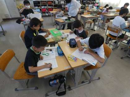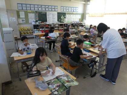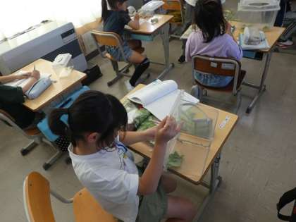 モンシロチョウやアゲハチョウの卵や幼虫の観察をして、ノートにまとめました。