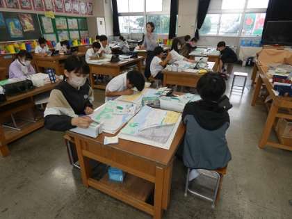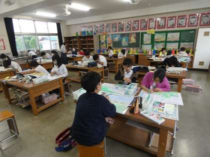 畝部小学校の校舎の絵の下絵ができたので、色を塗っていました。