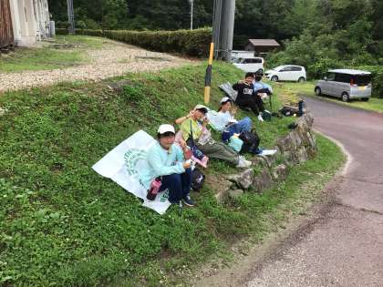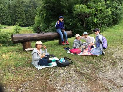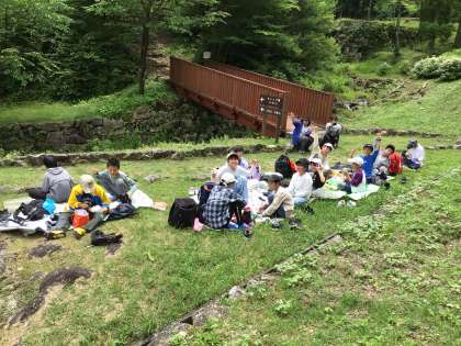 オリエンテーリングの途中で班ごとにお弁当を食べています。