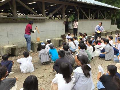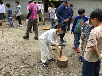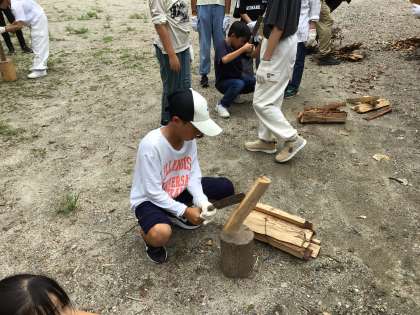 無事にオリエンテーリングを終え、夕食のカレーライス作りが始まりました。まずは、まき割りです。
