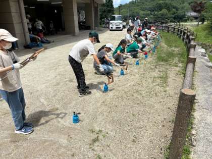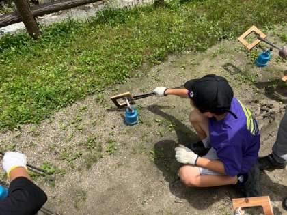 写真立て作りが始まりました。バーナーで木を炙って、焦げたところを布でこすっています。