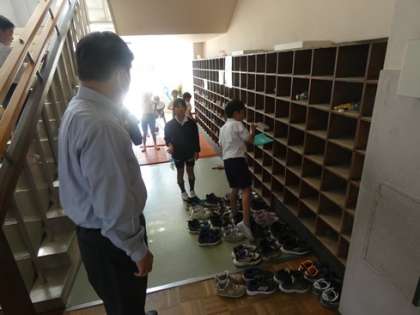 写真は、低学年の下駄箱の靴を全部出して丁寧に掃除している子を褒めて下さっているシーンです。畝部っ子たちが、掃除をしっかりやっていることを褒めてくださいました。