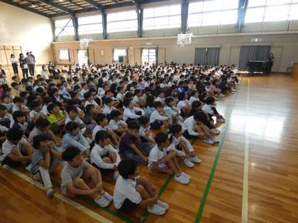 10月11日 切り替え集会 公開日 2024/10/11 更新日 2024/10/11 お知らせ 今日で前期も終わり、来週から後期が始まります。体育館で全校児童が集まって切り替え集会が行われました。3人の代表児童が、前期の振り返りと後期の抱負を堂々と発表してくれました。