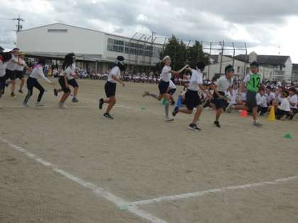 競遊「仲間と絆で架けろ!勝利の架け橋」では、上手に大玉を扱って大接戦でした。リレーでは、さすが高学年という力強い走りとバトンの渡し方を工夫したスムーズなバトンパスが行われていました。