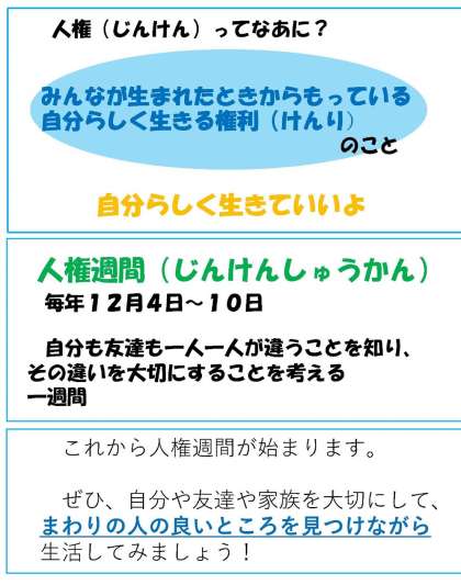 福祉・JRC委員会は、オンラインの児童集会の中で、人権週間を迎えるにあたり、人権についての確認と取り組みの紹介をパワーポイントを使って説明しました。