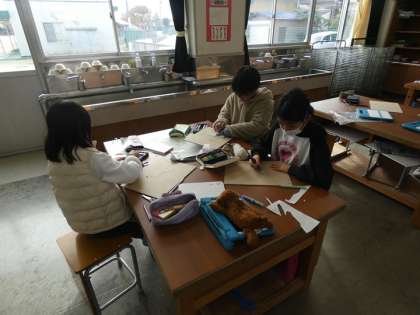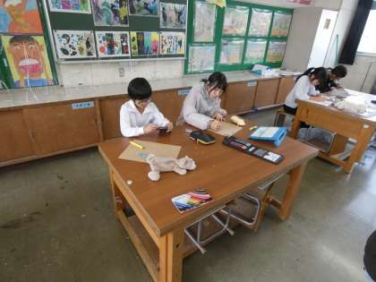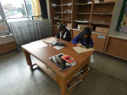 特徴をよくつかんで描かれた自画像を木版画にしていきます。今日は、彫刻刀を使って練習しました。