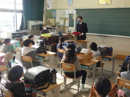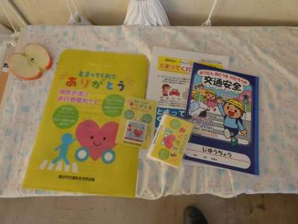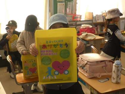 3年生 交通安全についてのお話 公開日 2024/12/20 更新日 2024/12/20 お知らせ 今年度、3年生は、ダンプカーを使った交通安全教室ができませんでした。そこで、豊田市交通安全会議の方が、3年生の帰りの会に来て、交通安全や「とまってくれてありがとう」運動についてのお話をしてくださいました。そして、写真のような交通安全啓発グッズを贈っていただきました。 自分できちんと判断して、交通事故に遭わないように注意していきましょう。