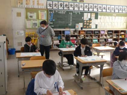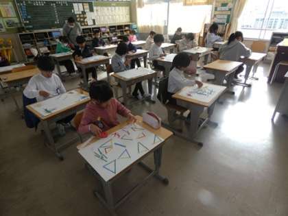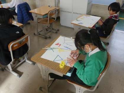 いろいろな長さの紙を組み合わせて三角形を作っていました。