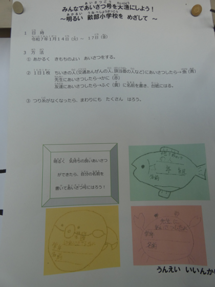 1月14日 あいさつ運動 公開日 2025/01/14 更新日 2025/01/14 お知らせ みんなであいさつ号を大量にしよう。〜あかるい畝部小をめざして〜をキャッチフレーズに運営委員会の企画であいさつ運動が始まりました。地域の人や先生、友だちにあいさつするとシールが貼れます。この取り組みであいさつできる子が増えるといいですね。