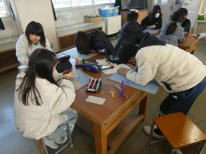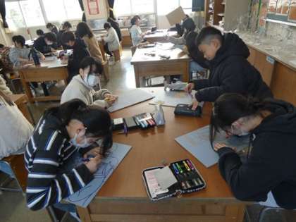 版画の下絵も終わり、彫刻刀で彫る段階に入りました。ケガをしないように、丁寧に作業ぢています。