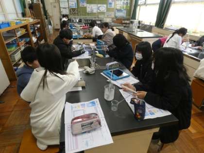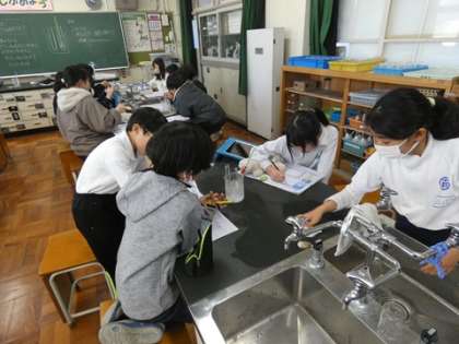 水を冷やしていくとどうなるかを、実験しました。みんな真剣に観察しています。
